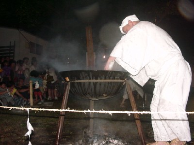 境内にて行者さんたちが釜の熱湯を身体にかけ、釜に入ったり、敷き詰めた炭火の上を歩く荒行で、信者や参観の人も